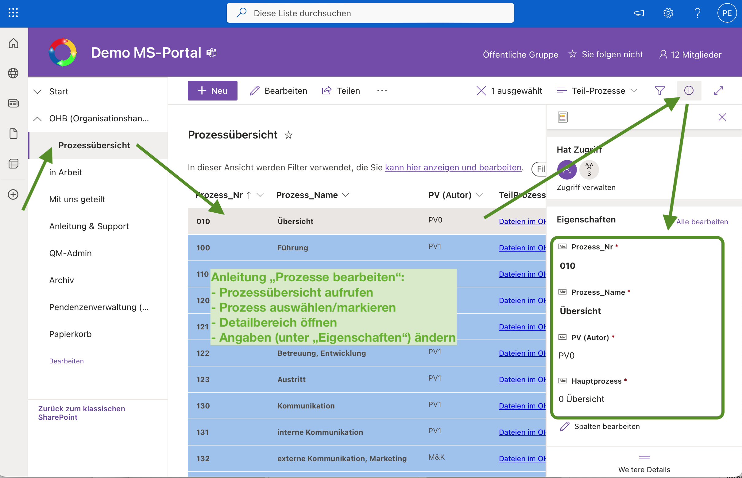 - Prozesse in der Prozessübersicht ändern